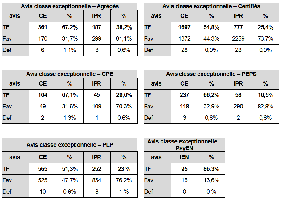 Les avis portés pour l’accès à la classe exceptionnelle deviennent un levier de management ou de tri pour choisir les personnels à mettre en rang utile dans les tableaux d’avancement, tri qui est renforcé, et rendu possible, par le traitement par discipline chez les certifiés, agrégés et PLP. La synthèse des avis IPR (ci-dessous) et CE nous confirme que les IPR limitent fortement leurs avis TF par rapport au CE.