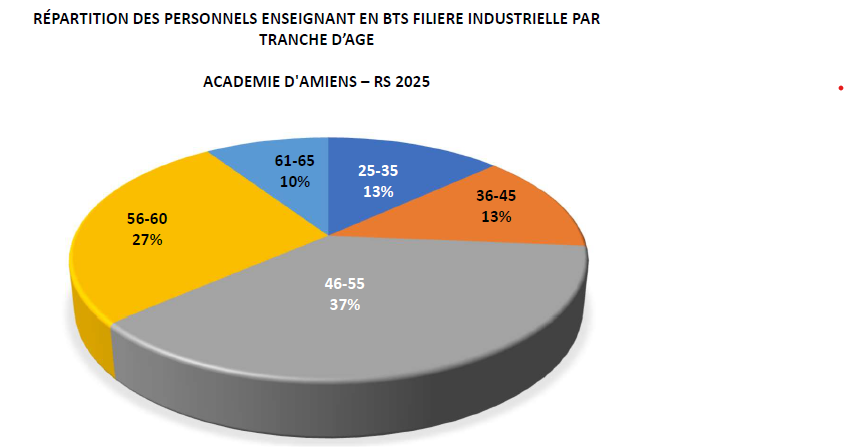 Les services RH des rectorats d’Amiens et de Lille ont fourni des données très intéressantes confirmant malheureusement les craintes de la FSU : dans l’académie d’Amiens, 37% des collègues de S2I ou de physique appliquée enseignant en BTS ont plus de 55 ans, et dans l’académie de Lille, 48% ont plus de 55 ans !