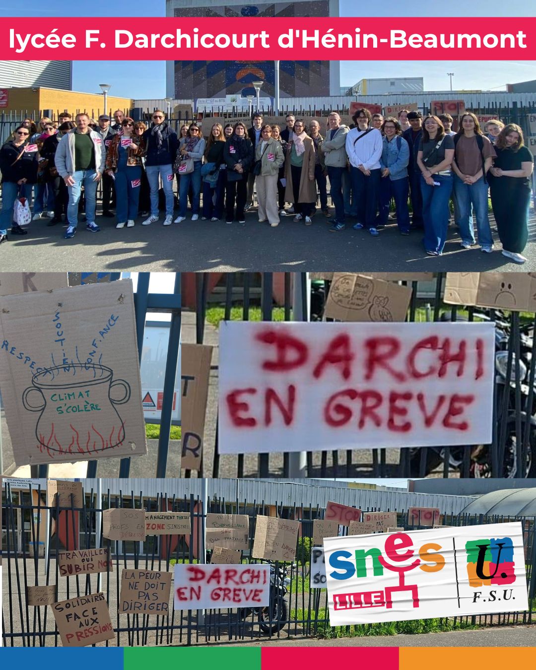 Vous êtes ici : Accueil Les établissements Echos des établissements Management toxique : grève majoritaire au lycée Darchicourt 9 avril 2026 Les établissements Management toxique : grève majoritaire au lycée Darchicourt Imprimer l'article Les collègues du lycée F. Darchicourt d’Hénin-Beaumont, en grève aujourd’hui contre le management toxique 👋👋👋 Avec le soutien du SNES-FSU 59/62 et en lien avec notre section locale.