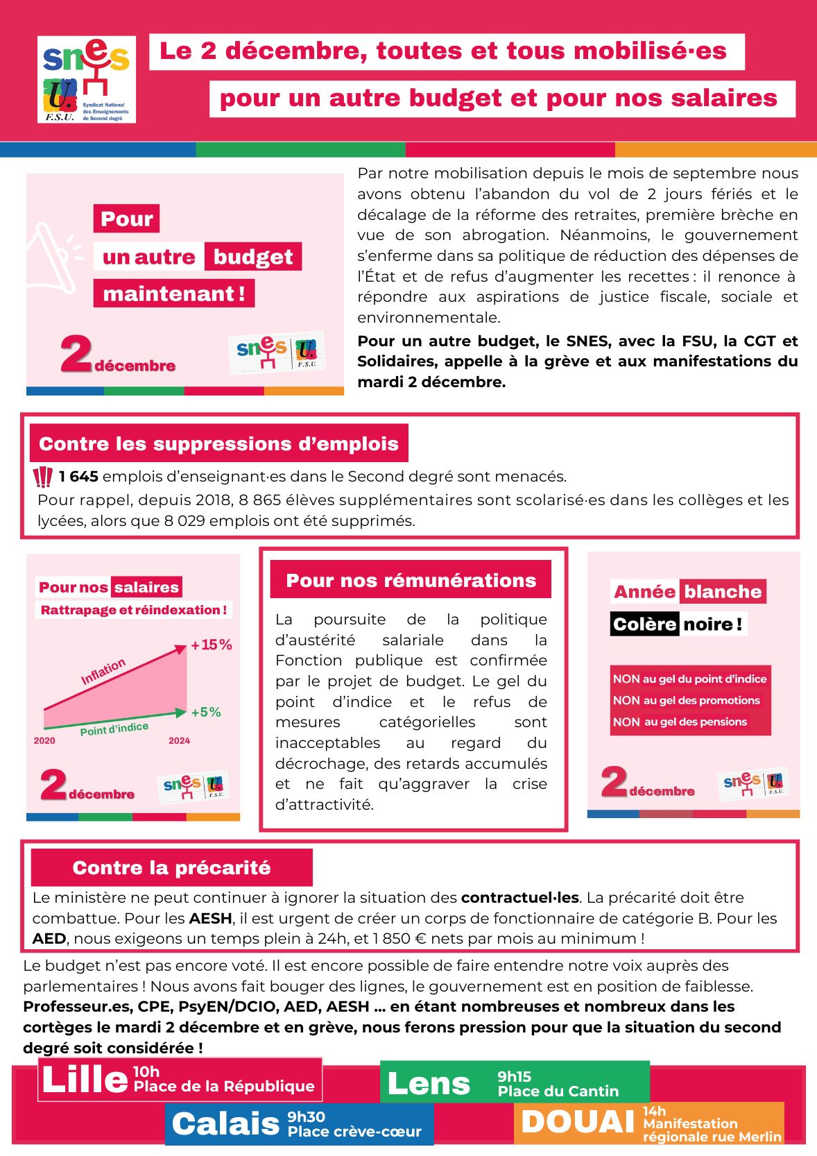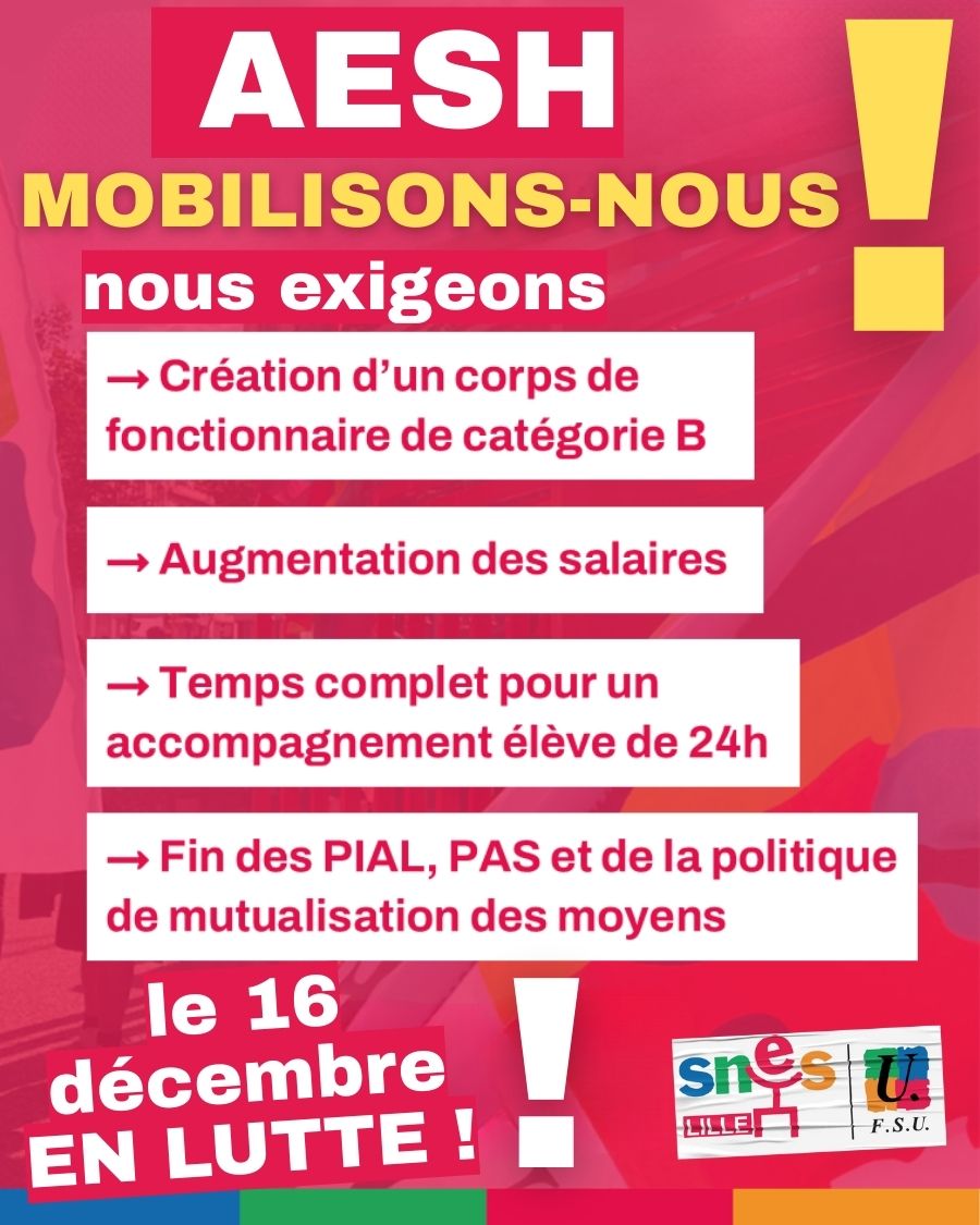 Important : le stage AESH est maintenu, il s’inscrira dans la journée d’action nationale. Il aura lieu au lycée Condorcet de Lens.