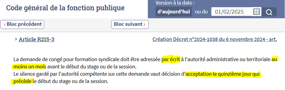 La demande de participation à un stage de formation syndicale est validée par défaut, si l’administration n’a pas répondu au plus tard 15 jours avant le stage.
