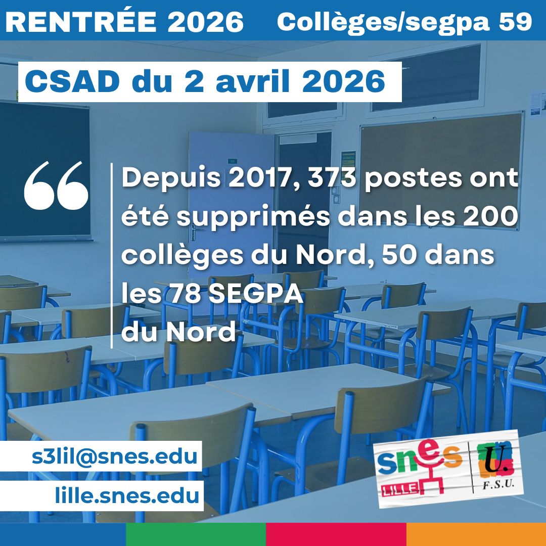 Les mesures sur les postes, conséquences des suppressions de moyens pour la rentrée 2026, ont été présentées par le Directeur Académique lors d’un CSAD59 ce jeudi 2 avril 2026. Cette instance a été précédée d’un groupe de travail le 23 mars pour prendre connaissance des mesures concernant les postes dans les collèges du Nord, suite aux conseils d’administration de février/mars. Le Snes, avec les FSU, y a évoqué des situations d’établissements grâce aux informations des collègues et a posé des demandes concernant des situations de postes relevées dans les documents préparatoires. Le contexte de suppressions de postes limite fortement les marges de manœuvre, cela va impacter également le mouvement intra en limitant les possibilités de mutation.