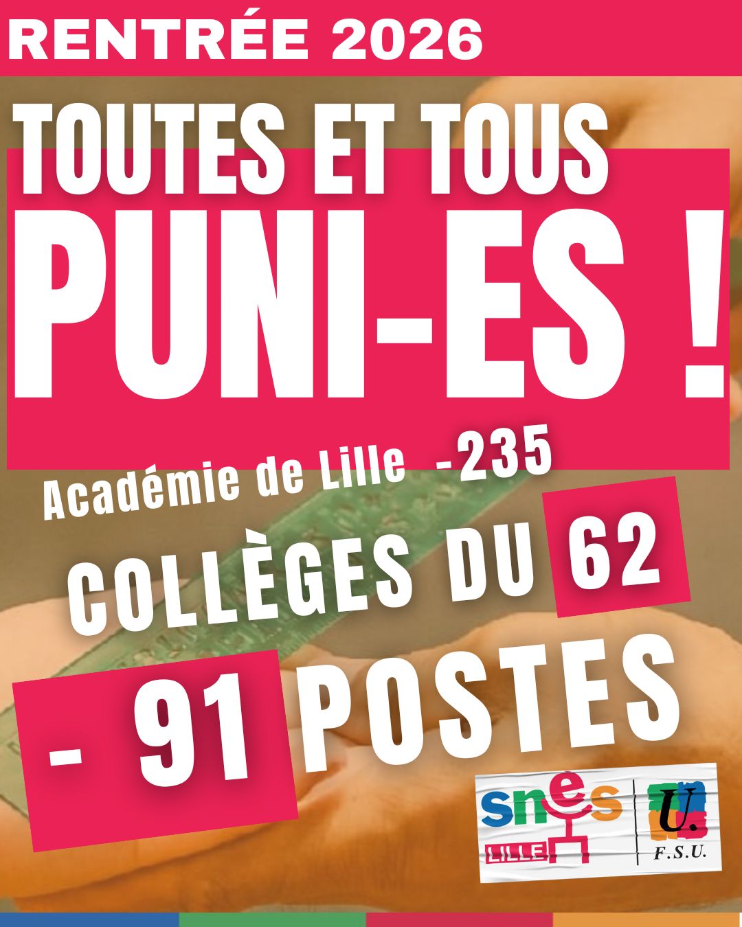 Le CSAD 62 s’est finalement tenu le mardi 3 février à 9h. Sans surprise, à la rentrée 2026, dans le Pas-de-Calais comme au niveau académique et national, les femmes et les hommes « qui allument patiemment l’esprit humain » - pour reprendre les mots de notre ministre actuel dans sa lettre aux professeurs du 22 janvier 2026- seront encore moins nombreux.